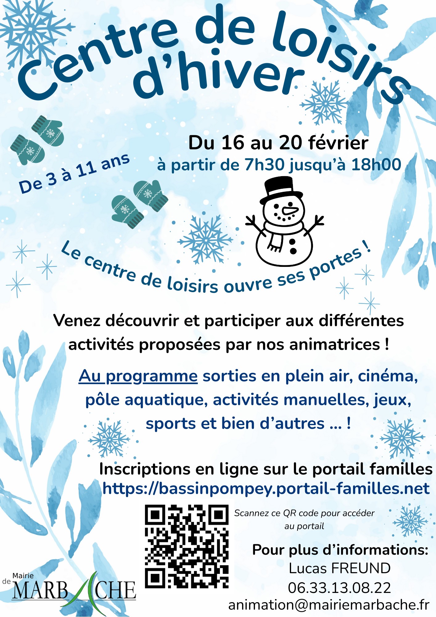 MERCREDIS RÉCRÉATIFS Pas d'école ? On se retrouve le mercredi ? Chaque semaine, les mercredis récréatifs ont lieu dans les locaux du périscolaire à la Maison des Enfants, 3 rue Clemenceau à Marbache. L'objectif est d'accueillir les enfants de 3 à 11 ans pour une journée ou une demi-journée d'activités. L'accueil se fait entre 7 h 00 et 9 h 00 jusqu'à 18 h 30 et la restauration du midi est assurée par la municipalité comme sur une journée scolaire classique. Parmi les occupations proposées aux enfants, on peut noter les activités suivantes : jeux de société, activités manuelles, sport,etc. N'hésitez pas à inscrire votre enfant ! Tarif en fonction du quotient familial |